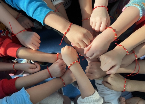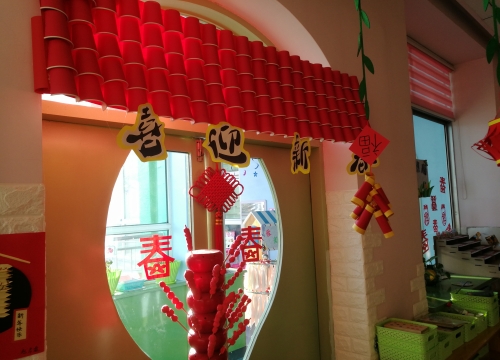 教师结合“欢欢喜喜过大年”等主题活动,组织幼儿贴春联、剪窗花、做福娃——将班级装扮得红红火火,喜气洋洋!教师首先借助视频、图片,向幼儿介绍“年”的来历、习俗;之后,教师组织幼儿欣赏“春节序曲”“小拜年”等经典节日乐曲,带领幼儿学做灯笼、福字、五彩鱼等,并充分利用特色课程教育幼儿掌握的技能,用剪纸、线绳编织、泥塑等方法制作了各种各样的七彩福球、中国结、吉祥手链等作品,将活动室装扮的年味十足!