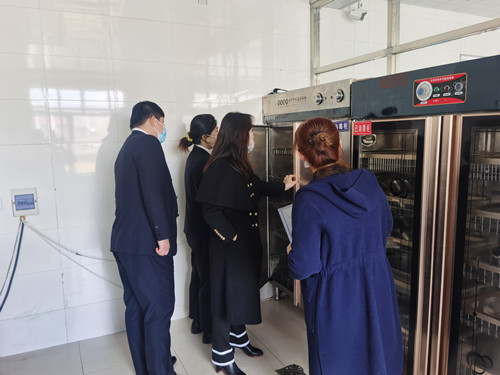姜科长一行首先对学校食堂的从业人员持证上岗、食品安全管理制度、环境卫生状况、食品原料采购贮存、食品加工操作流程等情况进行了仔细检查,随后,对食品原料采购、餐具清洗、消毒及保洁、食品原料贮存、食品留样等情况进行了解。通过听取食堂工作人员介绍和实地考察之后,对学校食堂工作给予好评。