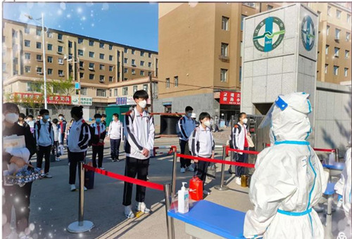 清晨的微风中,精神抖擞的初三学子们陆陆续续地走向阔别已久的校门。同学们遵守学校的防疫要求,佩戴着口罩,按照防疫通道的指示,保持两米间距,体温检测正常后,有序入校。寂静的校园瞬间就注入了活力,随着同学们的脚步,逐渐脉动、苏醒。