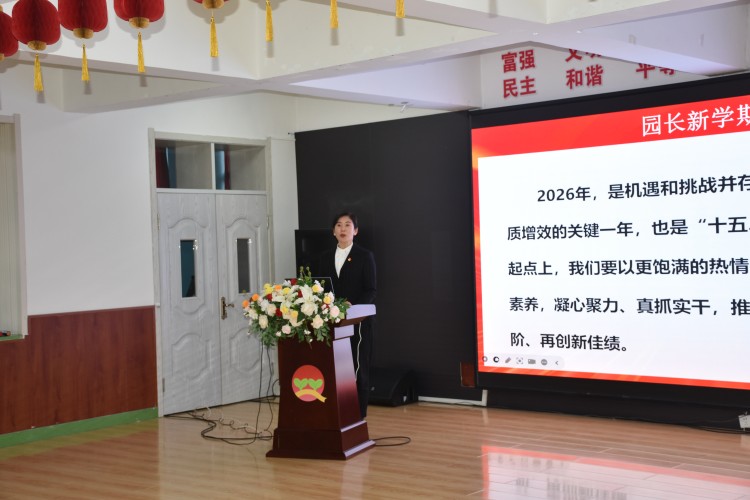 园长部署:人事分工明职责,重点工作指路径。园长孟庆杰作人事分工和重点工作部署,并发表新学期致辞。她指出,2026年是“十五五”开局之年,也是幼儿园提质增效的关键一年。她对全体教师提出八点希望:坚守育人初心,筑牢师德师风根基;聚焦保教质量,提升专业育人水平;严守安全底线,守护幼儿平安成长;升级教育服务,打造有温度的品质园所;强化全员宣传,扎实推进招生稳生工作;深化家园共育,构建协同育人格局;细化园所管理,保障工作有序推进;凝聚团队力量,共建和谐奋进大家庭。孟园长强调,新学期目标已明确,关键在于落实,希望大家以饱满的热情和务实的作风,共同书写幼儿园新篇章。